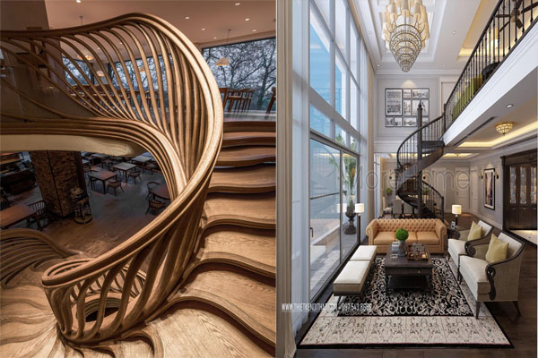 Thiết kế cầu thang gỗ với sự những bậc cầu thang là miếng gỗ tách biệt, từng đường cong uyển chuyển đã khiến bao con tim thổn thức