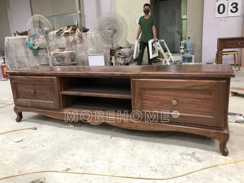 Xưởng sản xuất kệ tivi gỗ óc chó cao cấp tân điển của Nội thất MoreHome được trang bị nhiều hệ thống máy móc hiện đại, cùng đội ngũ tay nghề thợ sản xuất nhiều năm kinh nghiệm.