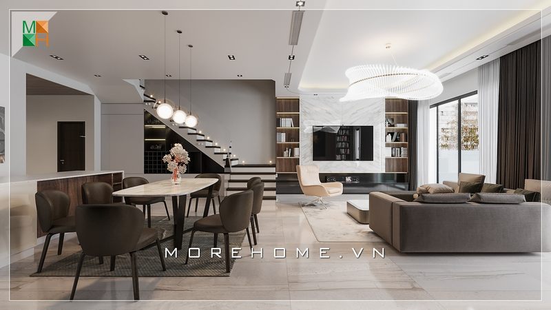 Mẫu thiết kế phòng khách liên kết với phòng ăn hiện đại được áp dụng cho các căn hộ, nhà phố và biệt thự đã tạo ra ấn tượng mạnh mẽ.
