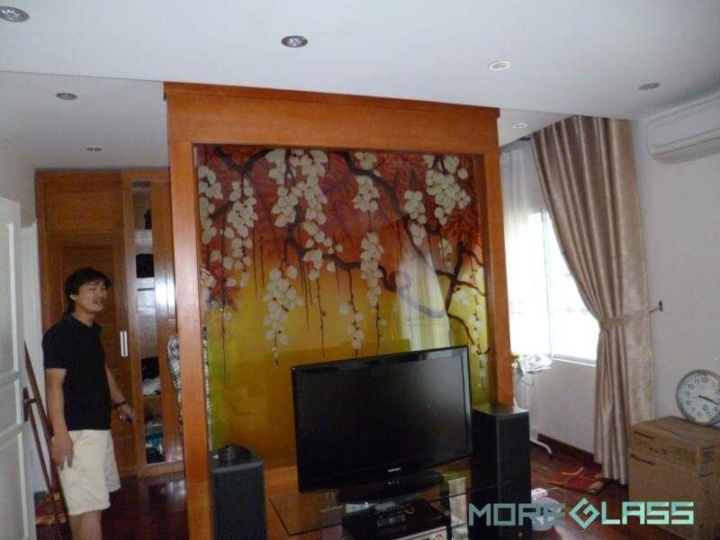 Mẫu thiết kế kệ tivi được kết hợp với tranh kính cường lực 3D nghệ thuật để tạo nên một không gian thẩm mỹ trong phòng khách chung cư, nhà phố.